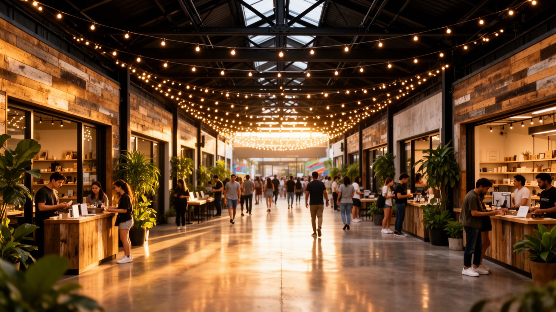 String lights, live music drifting from the food court, the smell of fresh coffee, kids running, friends discovering a new brand together. People don't just shop here — they stay.